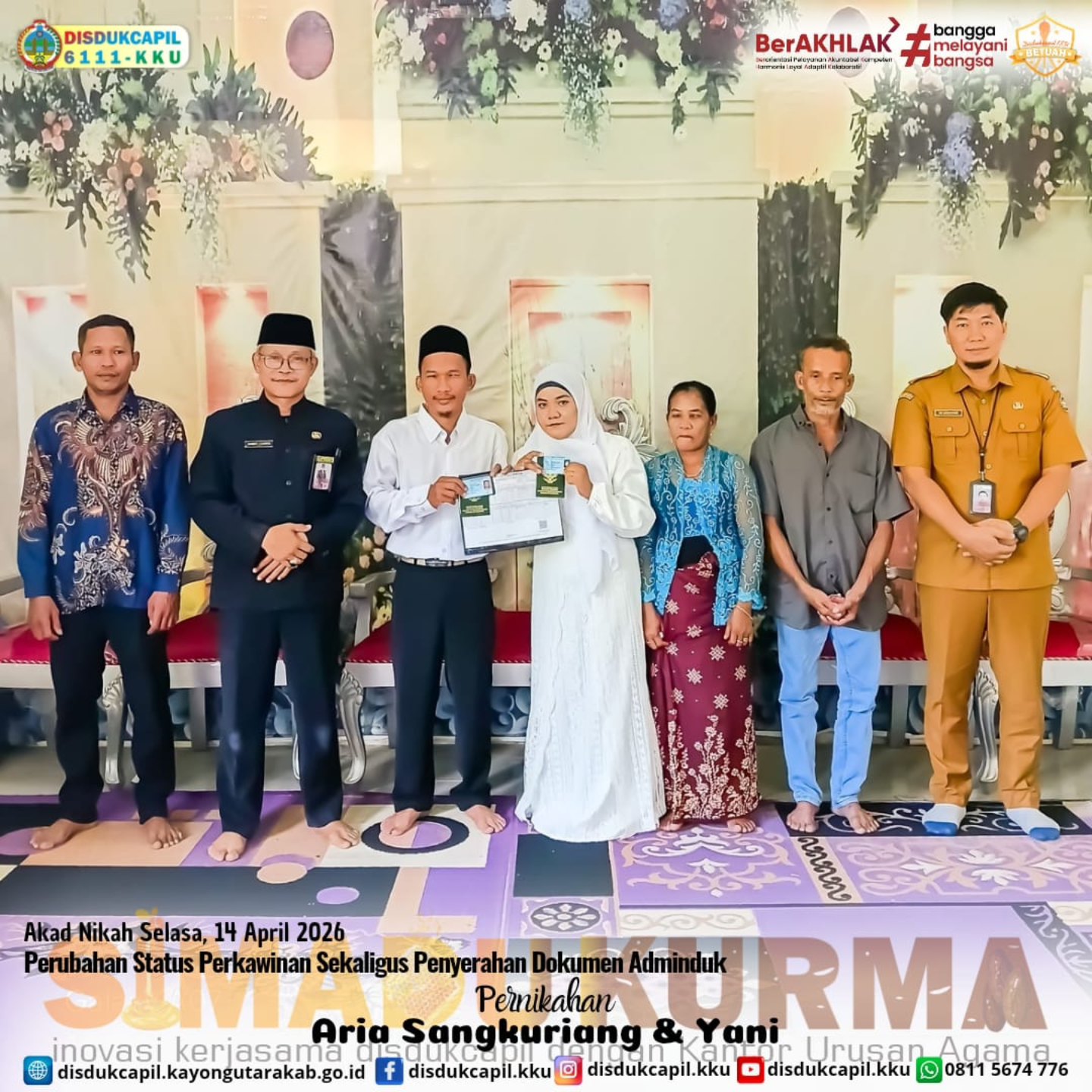 KAYONG UTARA – Langkah nyata dalam mewujudkan tertib administrasi kependudukan kembali ditunjukkan oleh Dinas Kependudukan dan Pencatatan Sipil (Disdukcapil) Kabupaten Kayong Utara bersama Kantor Urusan Agama (KUA). Pada Senin, 14 April 2026, kedua instansi ini bersinergi melaksanakan kegiatan Perubahan Status Perkawinan dan Penyerahan Dokumen Administrasi Kependudukan (Adminduk) atas peristiwa pernikahan yang baru saja dilangsungkan.